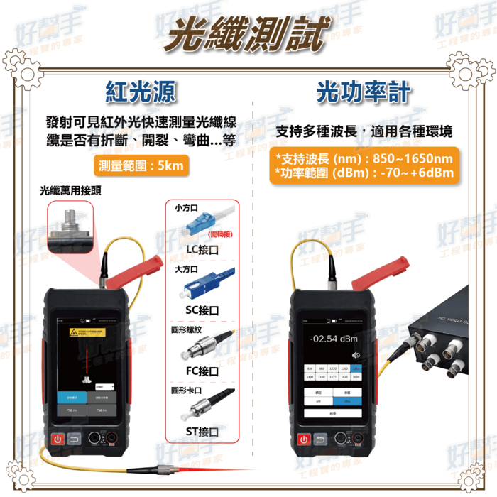- 內建光功率計,可用於測量光纖鏈路的耗損值。