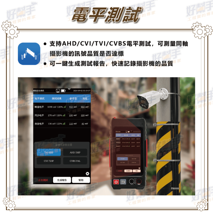 - 可檢測 AHD/CVI/TVI/CVBS 攝影機訊號的強度、峰值 (Vp-p),用以判斷 訊號強度是否正常。