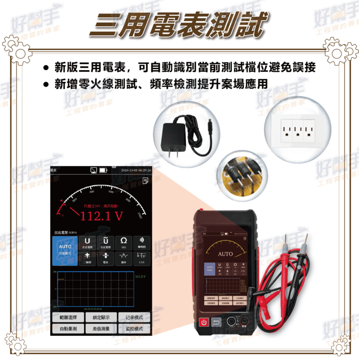 - 新版數位三用電表測試,可自動識別交/直流電壓、電流,免額外設定。