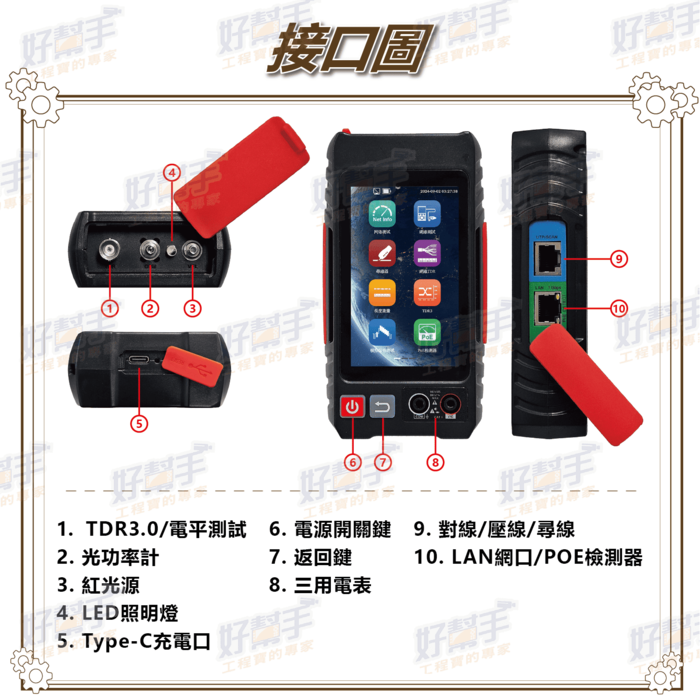 - 網線 TDR 測試,測試網線的線對通斷狀態、長度、衰減最遠可測達 180 米。
