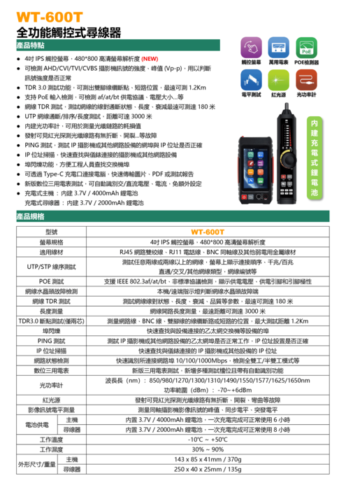 - TDR 3.0 測試功能,可測出雙腳線纜斷點、短路位置,最遠可測 1.2Km。