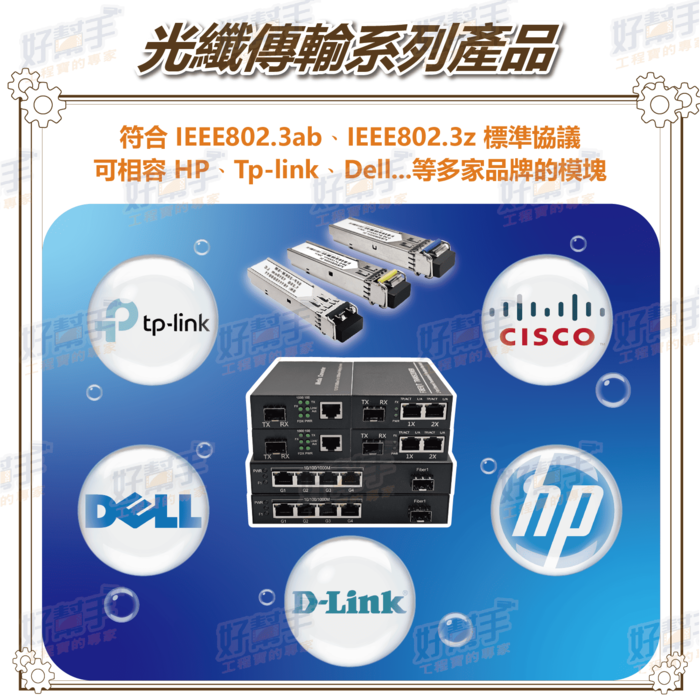- 符合 IEEE802.3ab、IEEE802.3z 標準協議,可相容多家品牌的模塊。