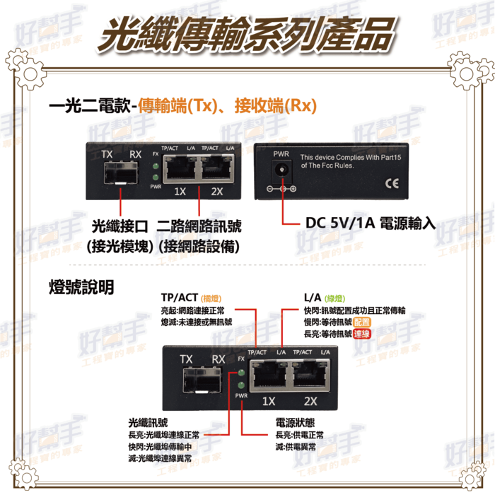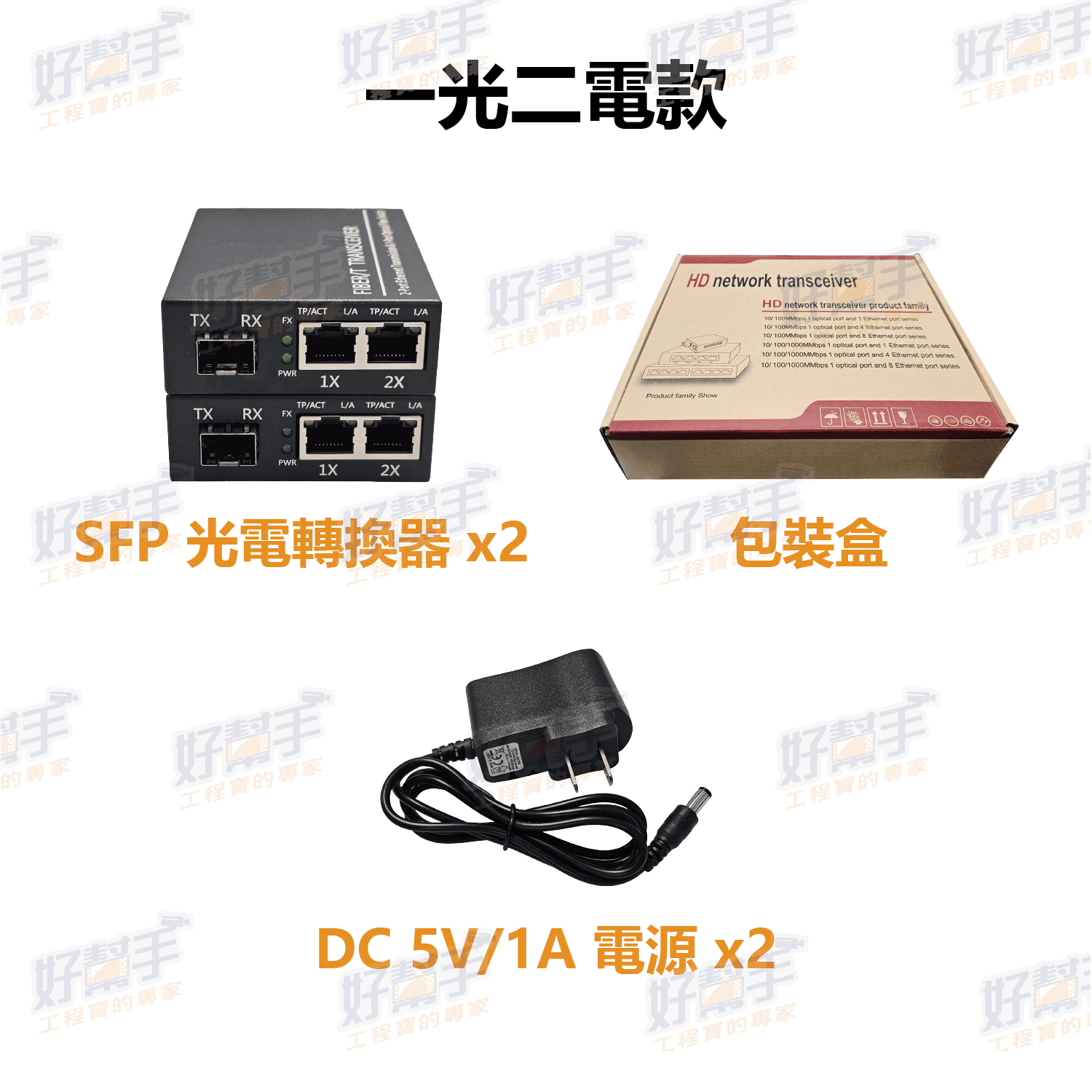 - 可將 2 路網路訊號透過 SFP 光纖接口傳輸。