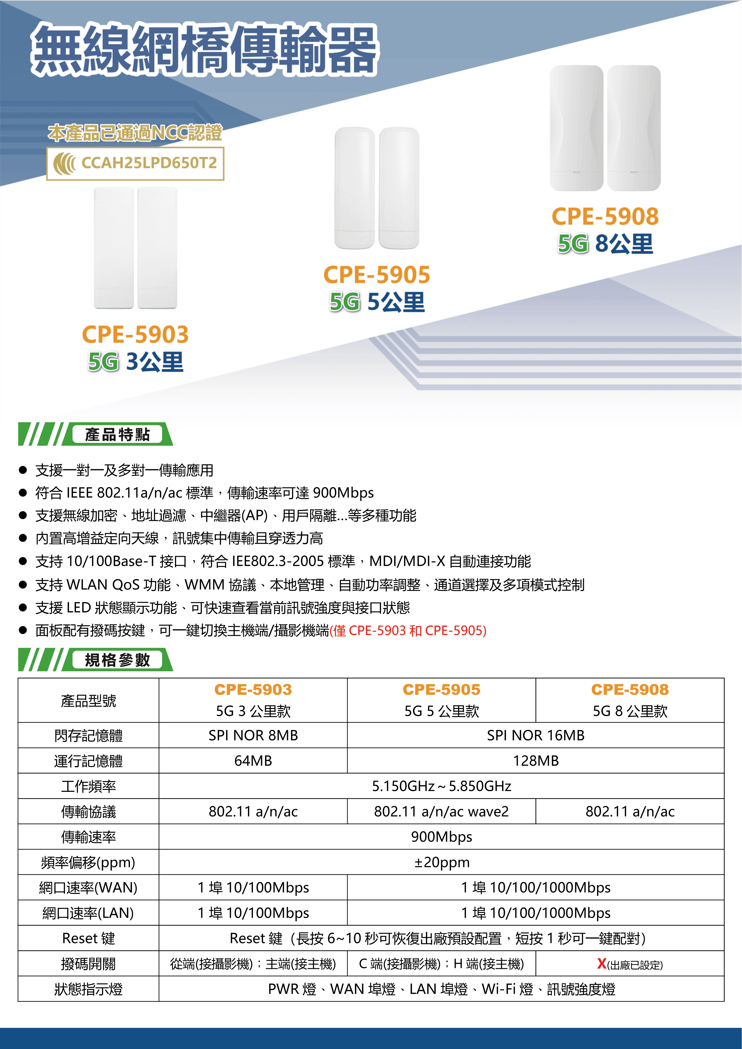 - 內置高增益定向天線,訊號集中傳輸且穿透力高。