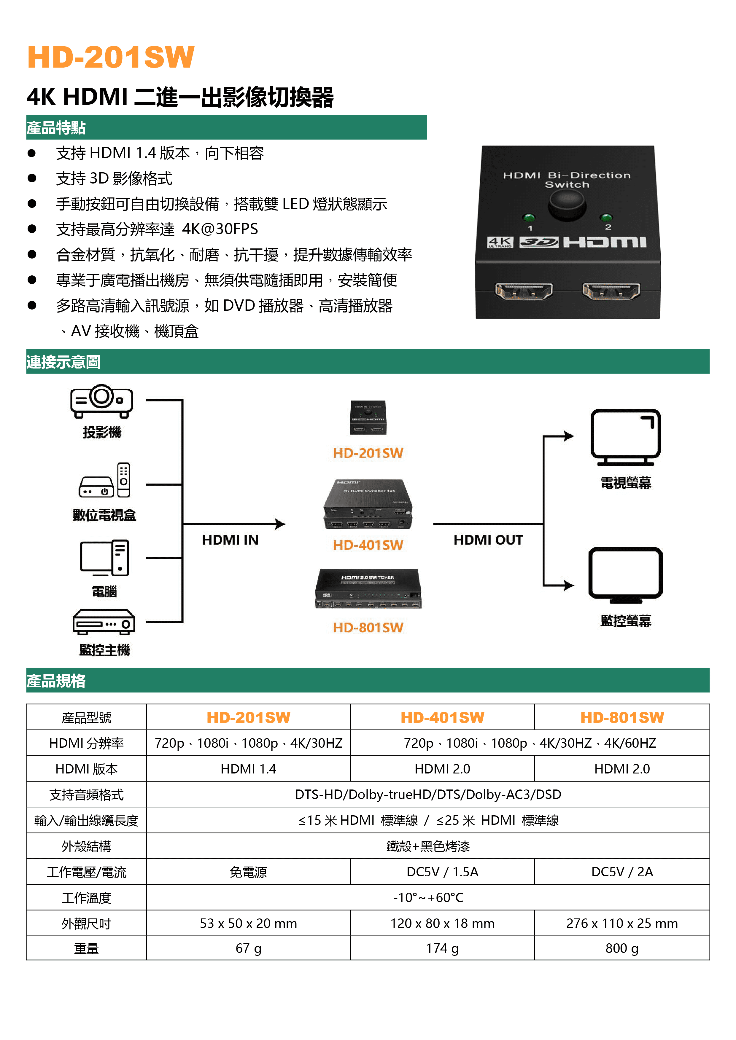 可將二路HDMI輸入訊號切換成一路HDMI輸出。