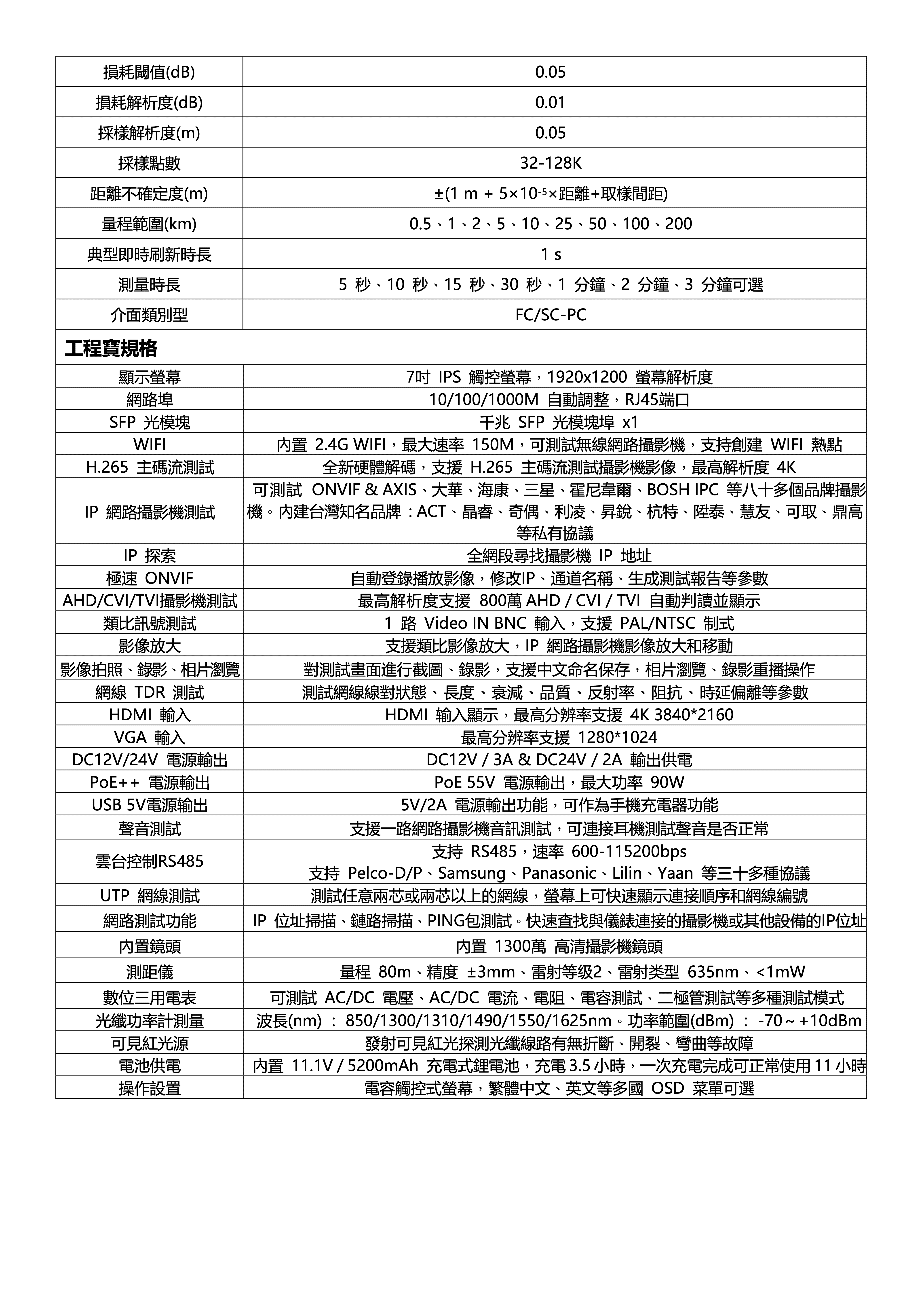- OTDR 雙波長光纖檢測,高動態範圍,最大測量距離 110 公里。