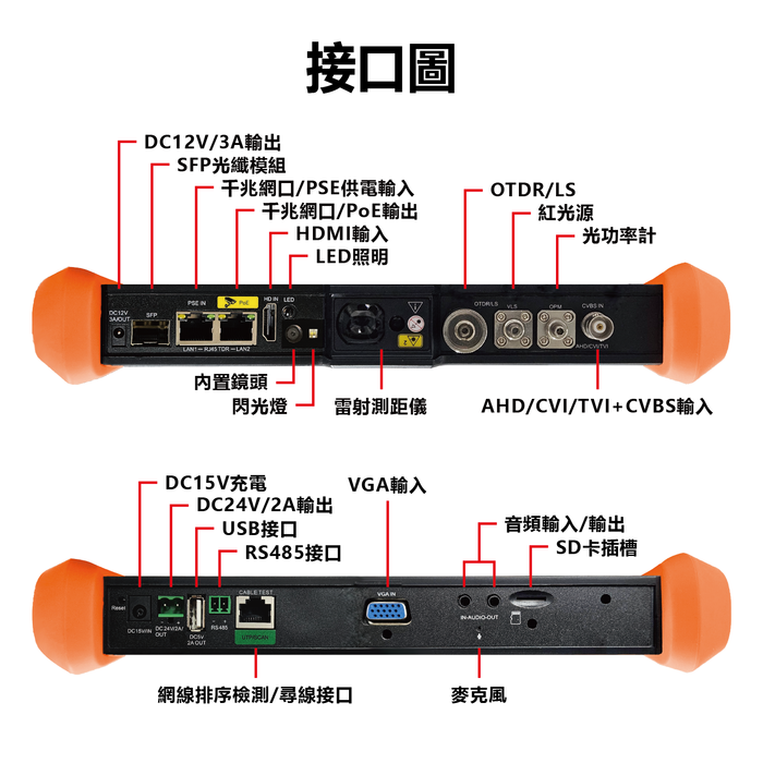 - OTDR 雙波長光纖檢測,高動態範圍,最大測量距離 110 公里。
