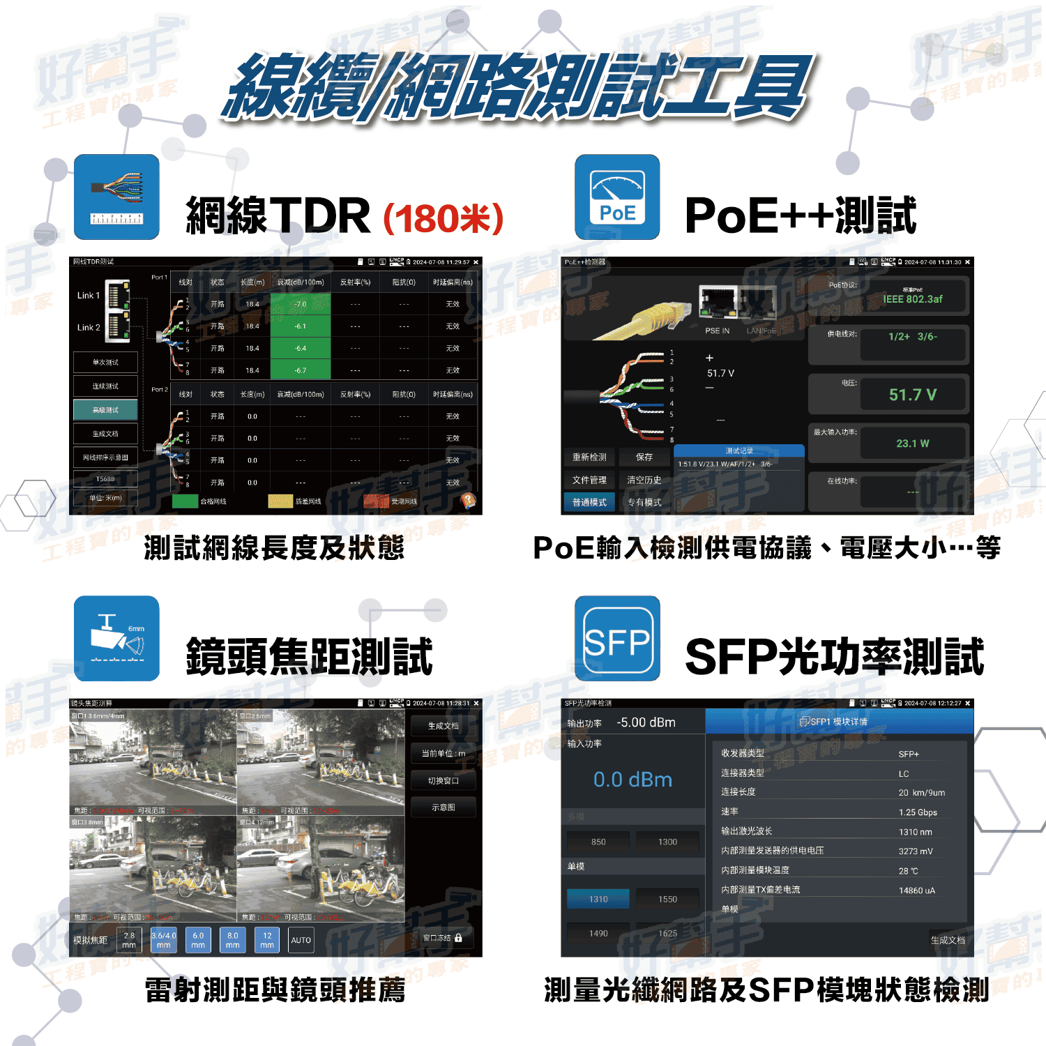 3.7V / 2000mAh鋰電池,支援網路線/電話線尋線、排序及驗電功能。