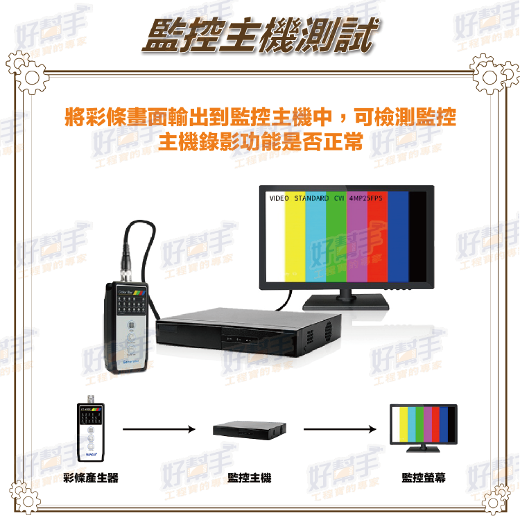 以 AHD/CVI/TVI/CVBS 四種訊號輸出彩條。