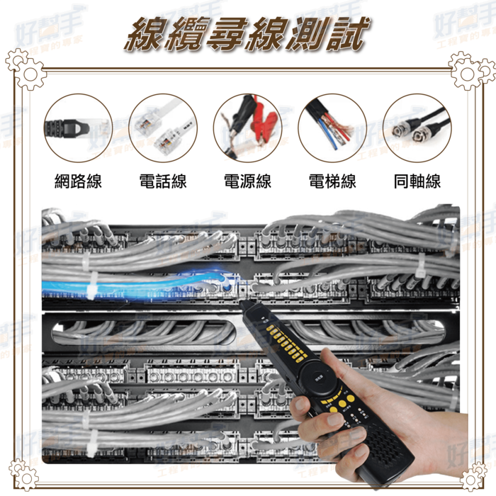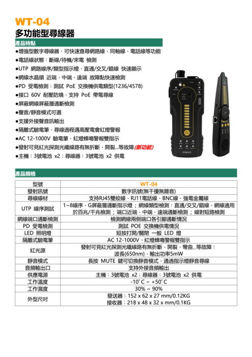 - 增強型數字尋線器,可快速查尋網路線、同軸線、電話線等功能。