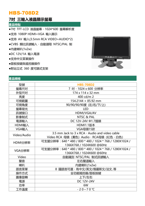7吋 TFT-LCD 液晶螢幕,1024*600 螢幕解析度。