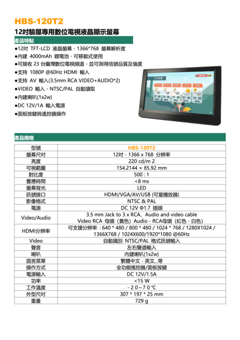 HBS-120T2_(12吋驗屋專用液晶螢幕)產品說明書