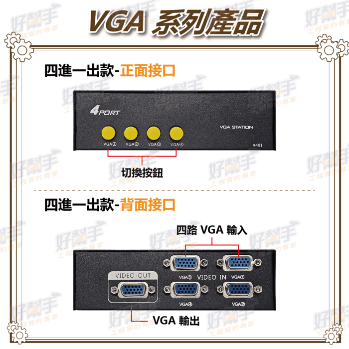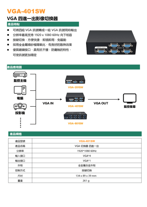 |可將四組 VGA 訊號輸入,切換輸出到同一顯示器。
