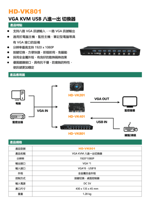 VGA KVM 八進一出 切換器 支援1080P / 一鍵切換 / 金屬外殼 / 抗干擾設計