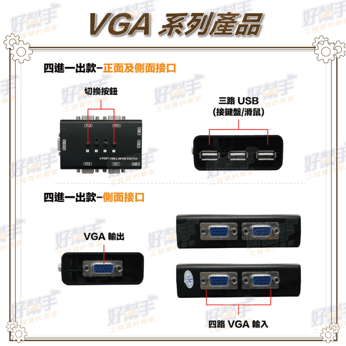 ✅ 多輸入設計|支援四組 VGA 訊號輸入,一組 VGA 訊號輸出。