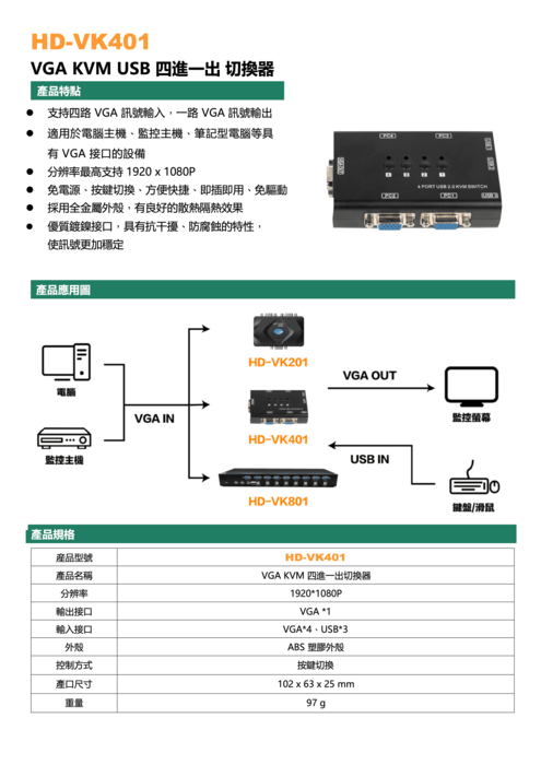 VGA KVM 四進一出 切換器 支援1080P / 一鍵切換 / 金屬外殼 / 抗干擾設計