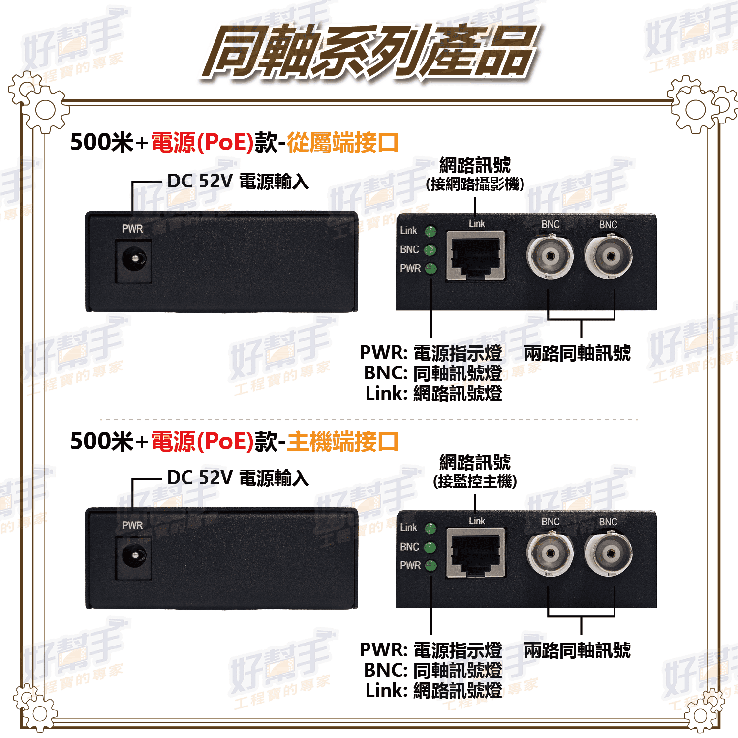 - 可將網路攝影機訊號透過同軸線纜帶POE供電延長傳輸。