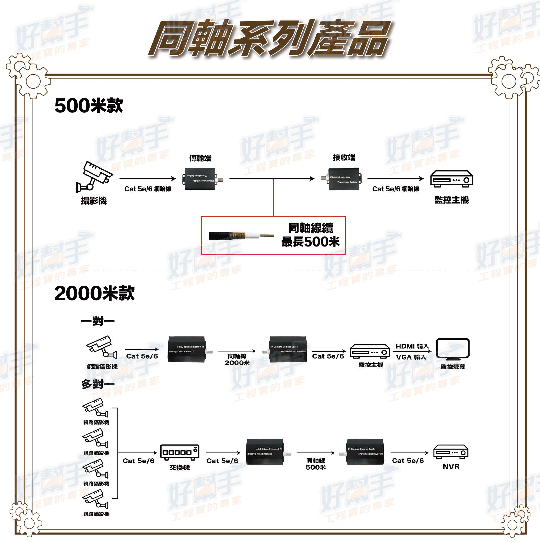 - 可將網路攝影機訊號透過同軸線纜延長傳輸。