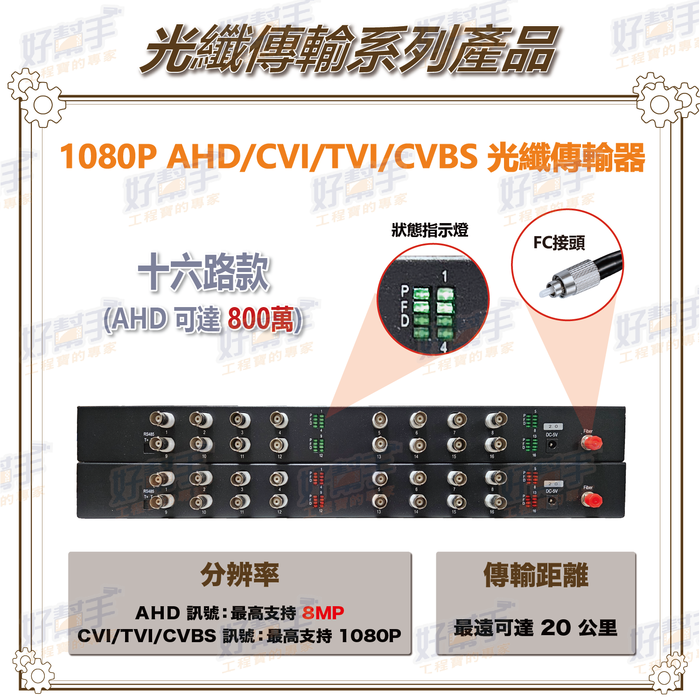 16 路 1080P AHD/CVI/TVI/CVBS 光纖傳輸器
