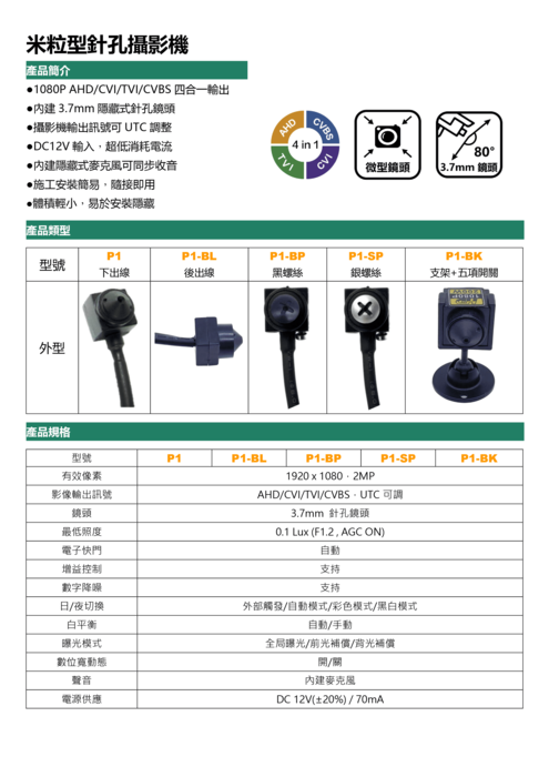P1-BL_(米粒後出線型微型攝影機)產品規格書