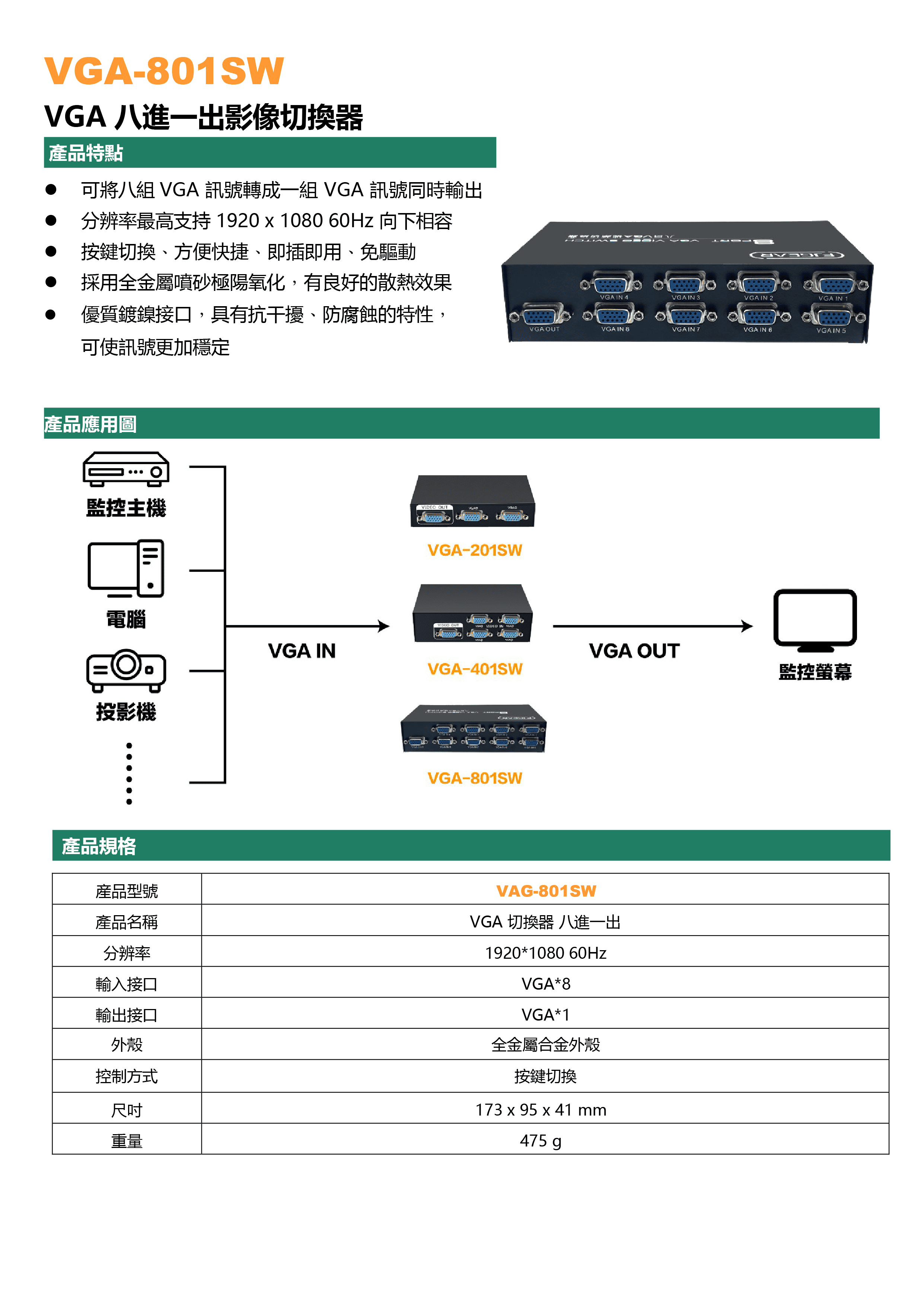 可將八組 VGA 訊號轉成一組 VGA 訊號同時輸出。