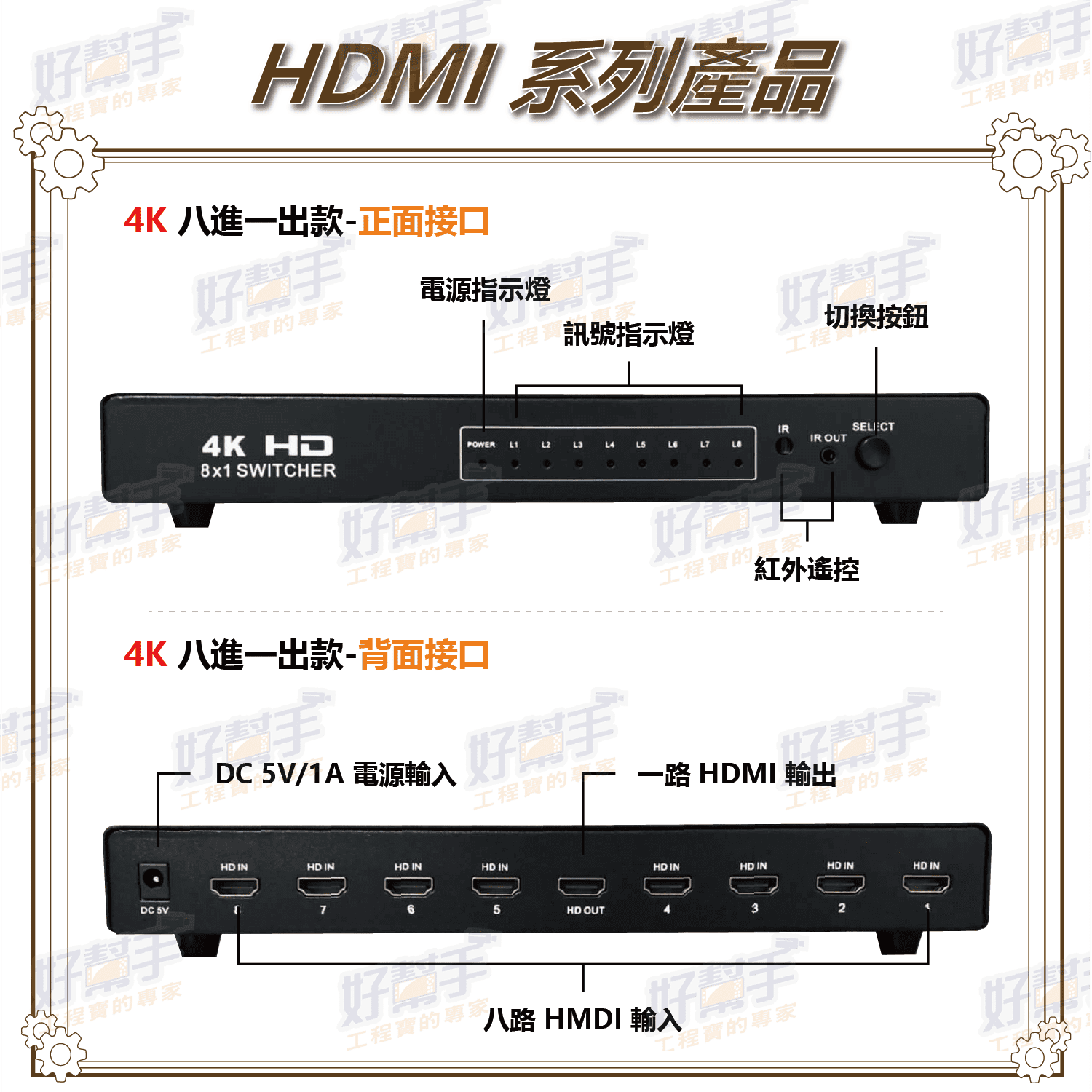 可將八路HDMI輸入訊號切換成一路HDMI輸出。