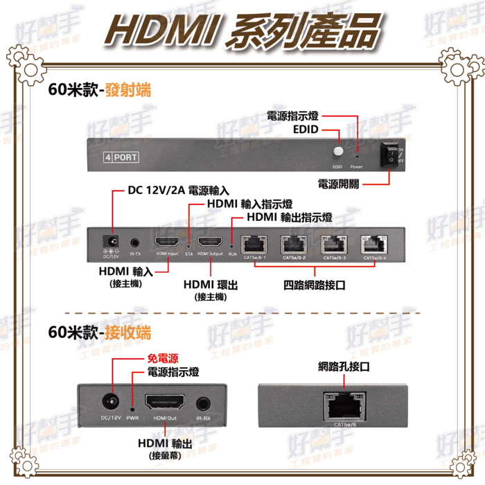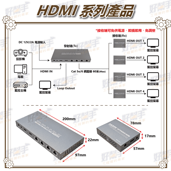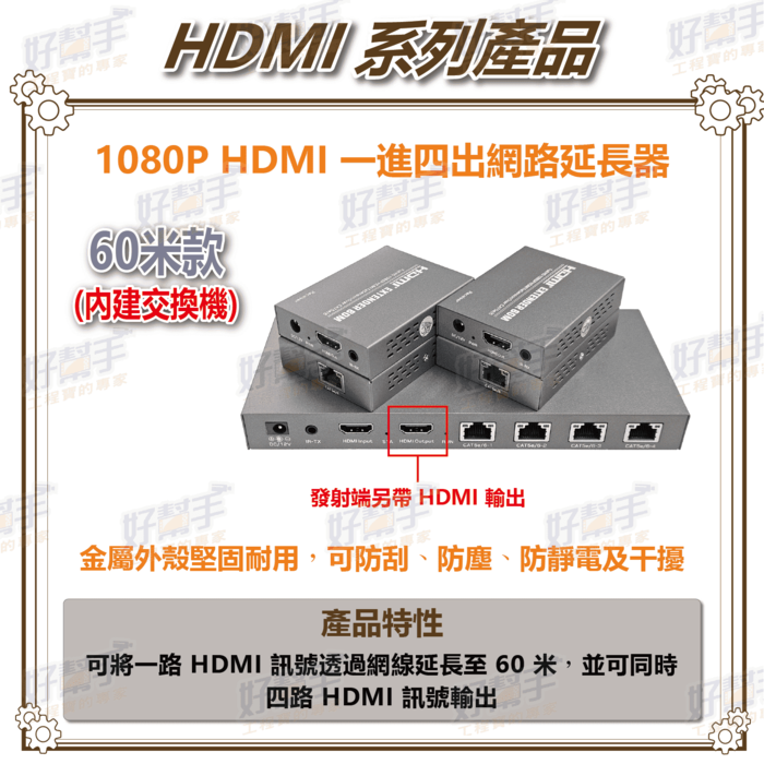 可將一路 HDMI 訊號透過網線延長至 60 米,並可同時四路 HDMI 輸出。