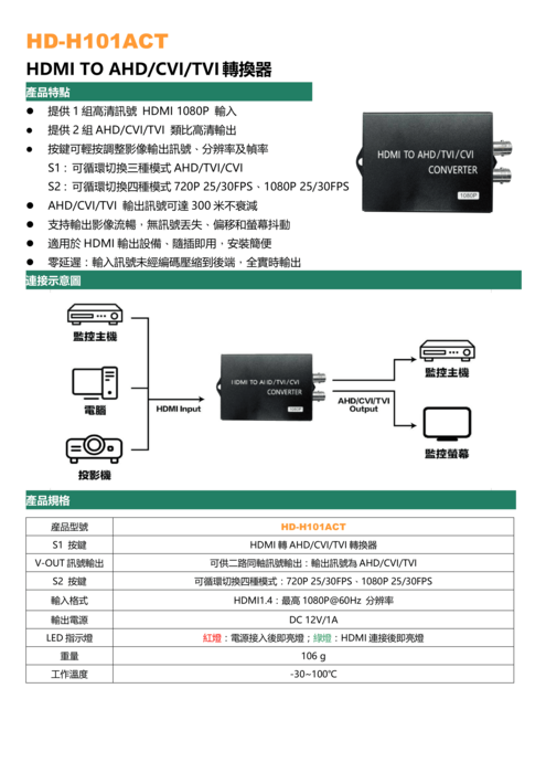 HDMI 轉 AHD/CVI/TVI 轉換器HDMI 轉類比高清 / 零延遲輸出 / 多格式相容 / 即插即用