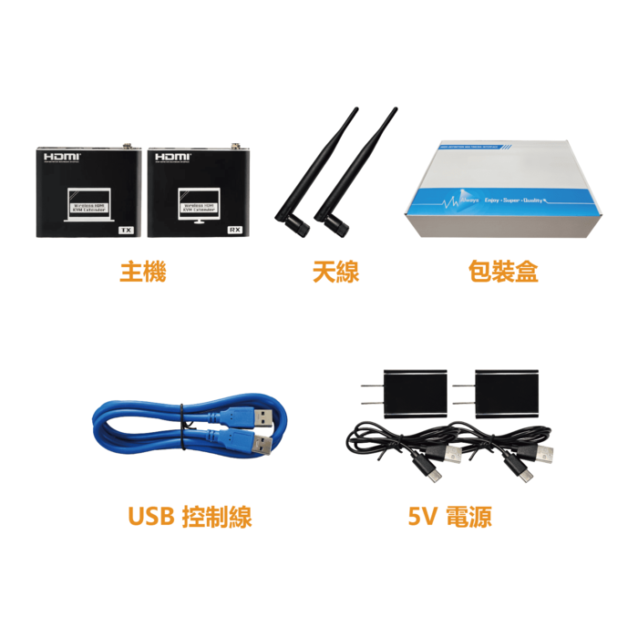 - 可將一路 HDMI 或 USB-C 訊號透過 2.4G 無線 延長傳輸,並可同時控制遠端設備的鍵盤與滑鼠。
