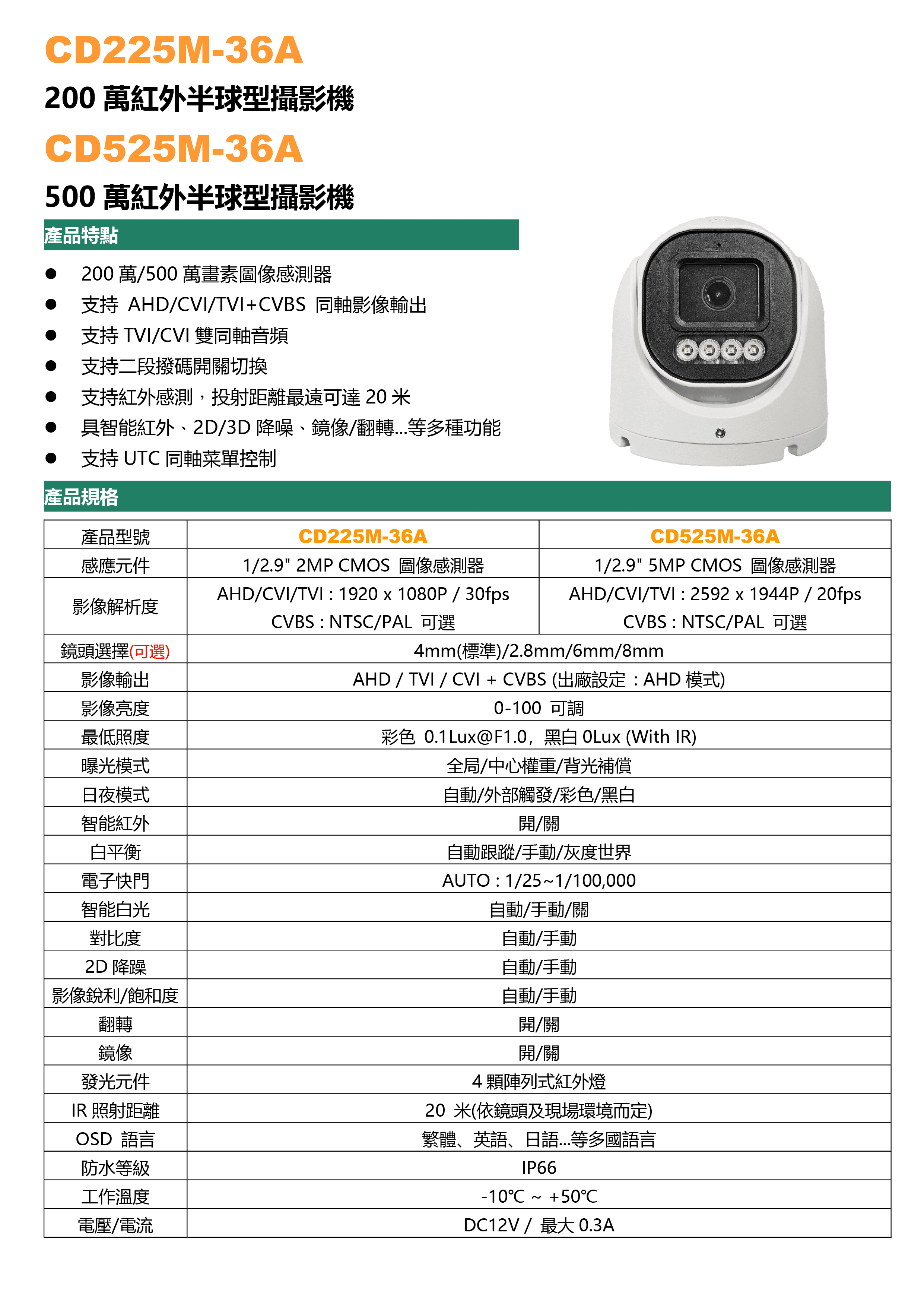 CD225M-36A_CD525M-36A(200萬和500萬紅外半球型攝影機)產品規格書