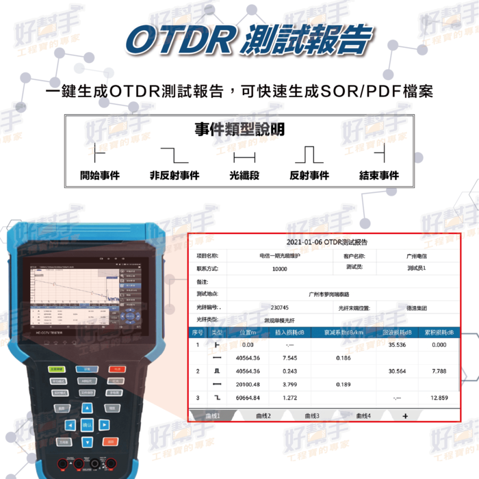 - OTDR 測試結果保存爲 SOR、PDF 或截圖等文件。