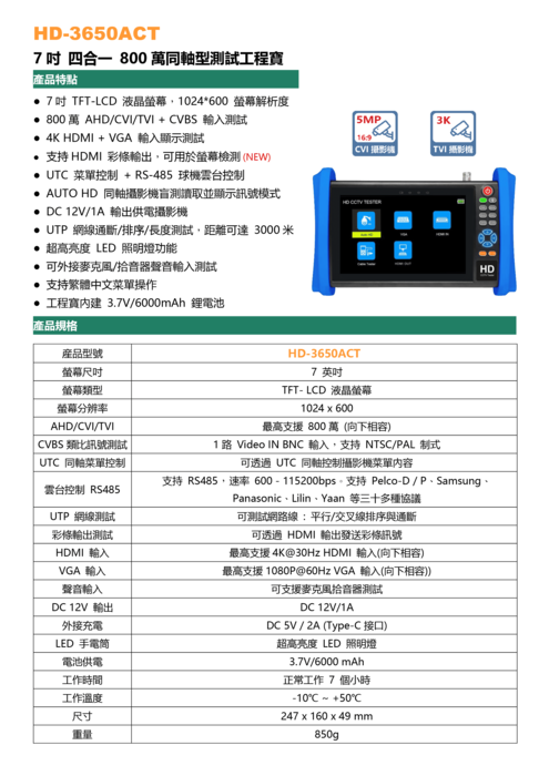 7吋四合一800萬同軸型測試工程寶