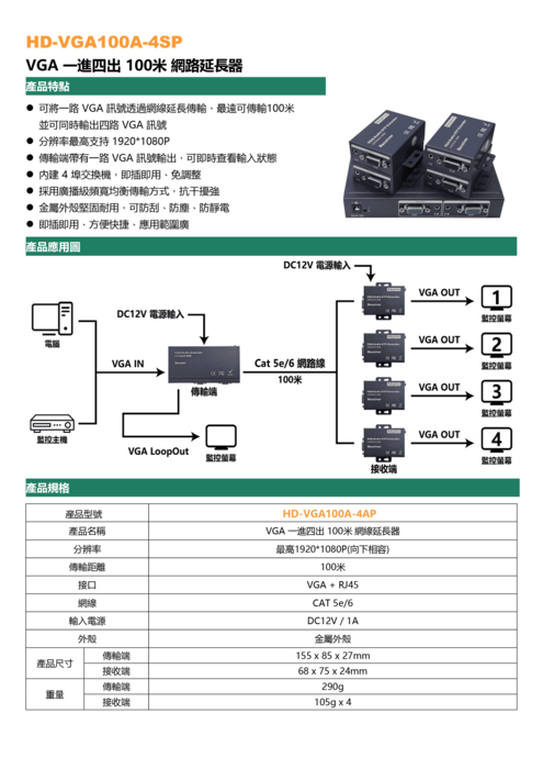 HD-VGA100A-4SP(VGA 一進四出100米網線延長器)產品規格書