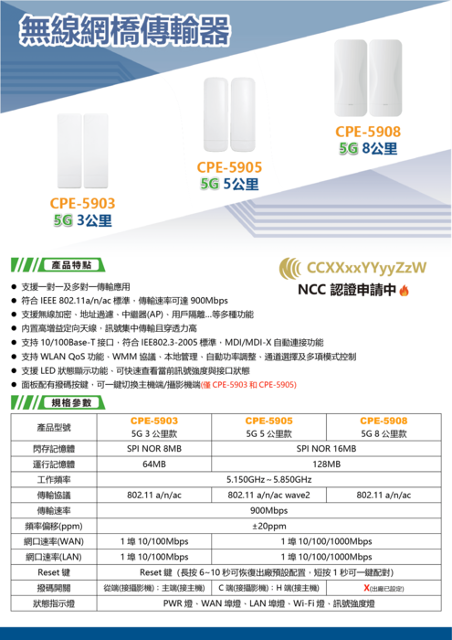 - 符合IEEE 802.11a/n/ac標準,傳輸速率可達900Mbps。