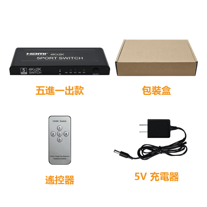 可將五路HDMI輸入訊號切換成一路HDMI輸出。