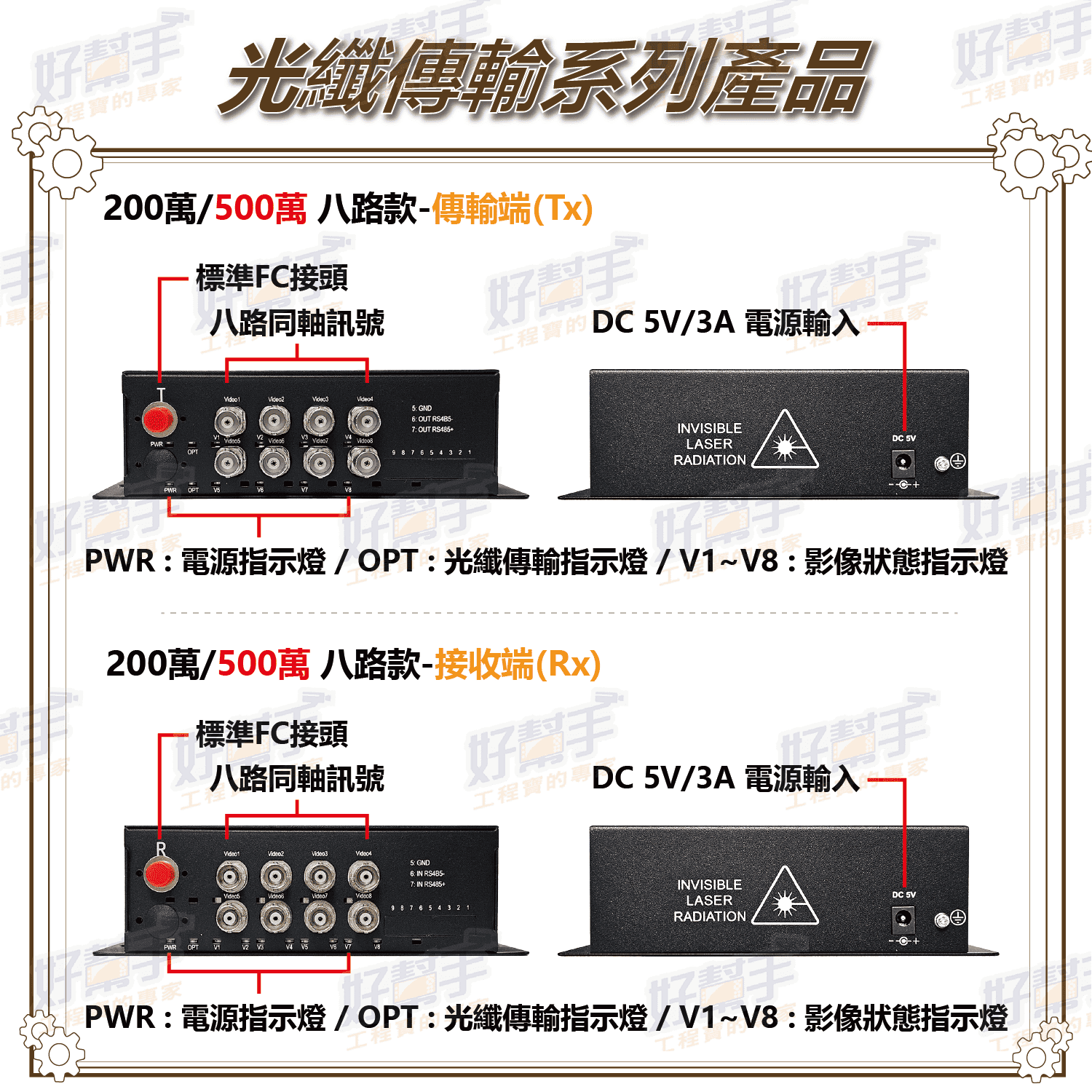 可傳輸 8 路 200 萬 同軸高清攝影機訊號。