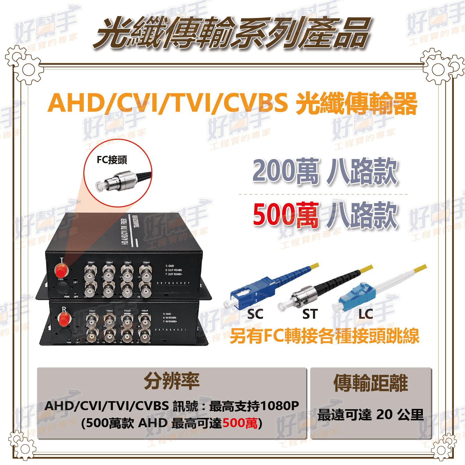 8 路 1080P AHD/CVI/TVI/CVBS 光纖傳輸器